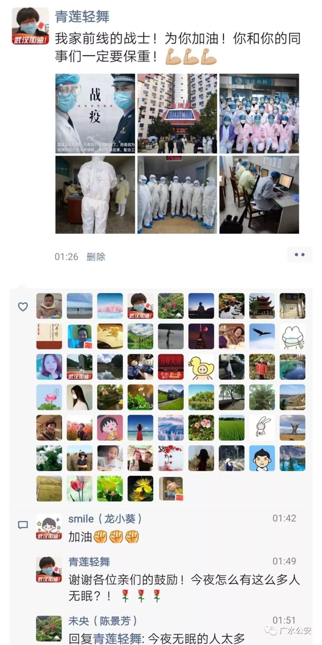 在感染接诊区,医院规定医生不能接打电话。休息间隙,李述蓬在微信朋友圈里,给妻子留言,道出了重压之下,睡眠极差,担心战友和危重病人的苦衷。严丽赶紧在朋友圈回复,安慰、鼓励,没想到引起广大网友的纷纷点赞。
