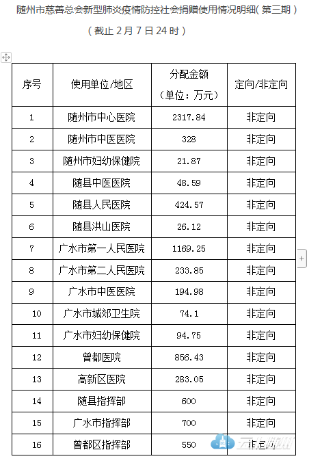 截至2020年2月7日24时,随州市慈善总会接收疫情防控社会捐赠款共计22304.70万元,已分配拨付17563.49 万元。第二批已分配资金因项目调整,其中846万资金暂未拨付,待重新分配使用。第三批8073.4万已分配拨付,明细如下,欢迎社会各界监督。