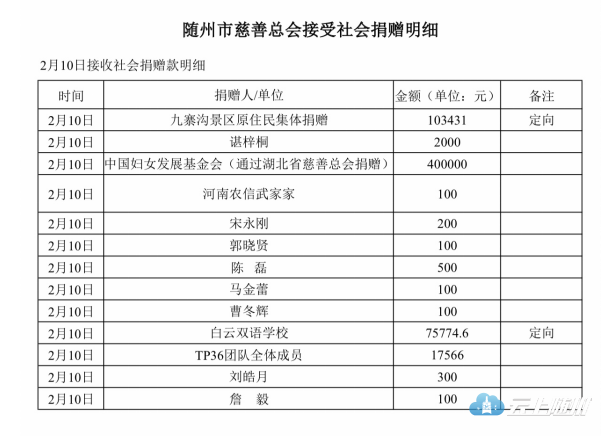 截至2020年2月10日24时,市慈善总会共接收捐赠款22739.56万元(其中省慈善总会拨付资金21482万元)。接收捐赠款中,定向捐赠729.15万元,非定向捐赠22010.41万元(含省级拨付)。2月10日新增捐赠款60.02万元(含省慈拨付资金40万元,社会捐赠20.02 万元),明细见下表,欢迎社会各界监督。