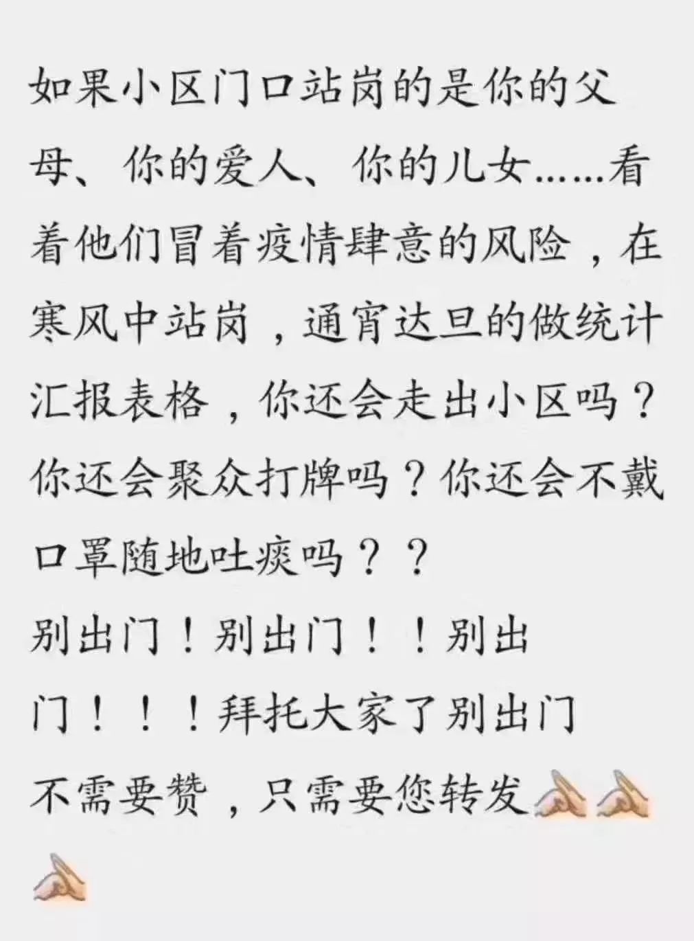 我真心的呼吁广大的年轻朋友,管好家里的老人和孩子,告诉他们不要再以“我要去散步”“我要买包烟”“我要买猫粮”这样的理由出门,给他们讲讲疫情的严峻,给他们说说我们这些防疫战士的不易,让他们好好待在家里,不要去给社会添乱,不要去和您家门口的站在寒风里的干部吵架,因为他们在用自己的生命和健康在保卫您家的健康和幸福。告诉您的家人,配合就是对我们工作最大的支持,也是对祖国最大的热爱。