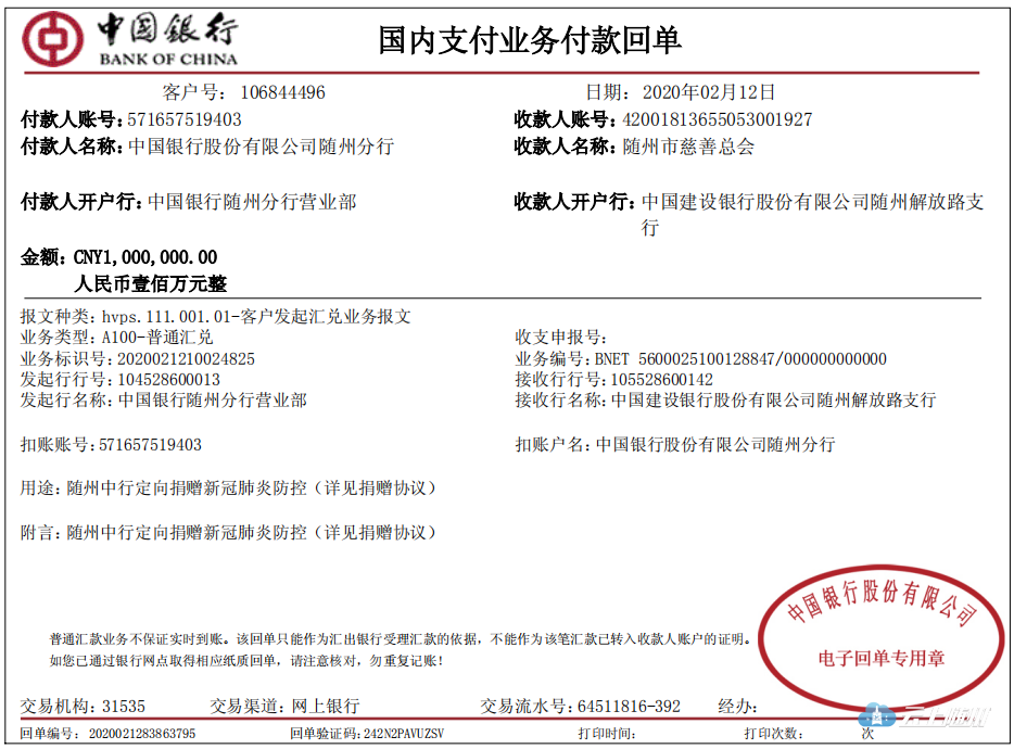 2月12日上午,中国银行随州分行向随州市慈善总会捐赠100万元,全力支援随州市抗击新型冠状病毒感染的肺炎疫情。