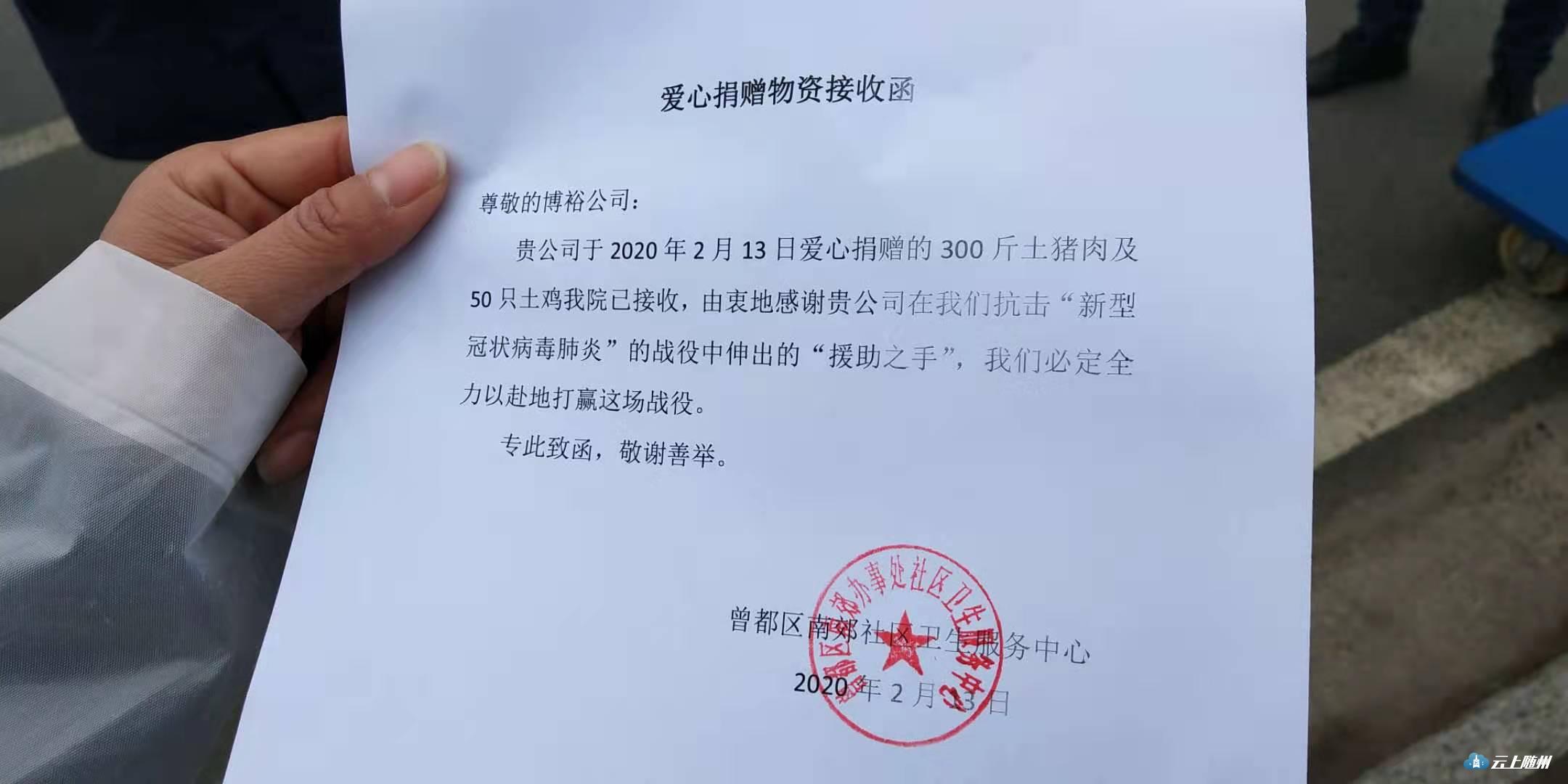 今天上午,市商务局组织爱心电商企业博裕公司给曾都区南郊卫生院送去300斤猪肉和50只三黄鸡,用于改善卫生院200多名一线医护人员的生活。曾都区南郊卫生院目前收治疑似患者36人。 记者:孙文通 编辑:鲁京京 审核:陈凡