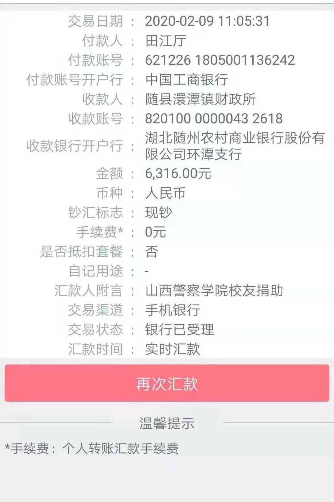 2月8日,田江厅动员山西校友支持随州抗击新冠肺炎, 20余位好友共捐款5316元,田江厅个人捐赠1000元。目前,该笔资金已到财政专户专门用于疫情防治,其他三批医用物资在快递邮寄的路上。