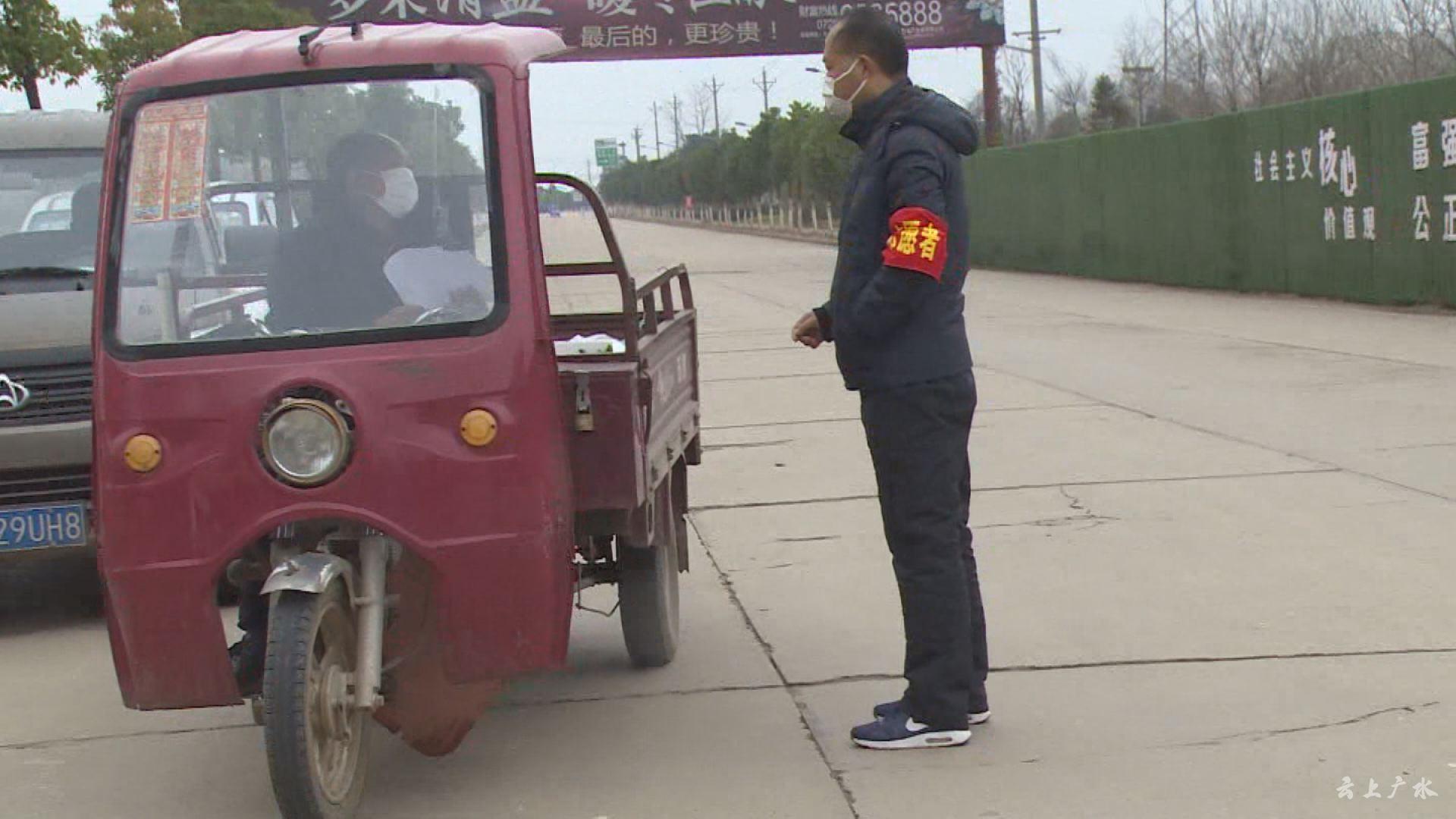 值勤人员朱勇说: “当时我在这里执守,对面来了一辆从北到南的车子,我伸手示意他停下来,他把车窗摇下来后,我告诉他现在非常时期私家车不允许上路,他说买东西,我说买东西要到村里报备集中采购,然后话还冒说完他车子一加速向前行驶,把我带了大概十几米远,摔在地上,右手体温枪也摔碎了,当时摔得比较重,基本上不能动。”