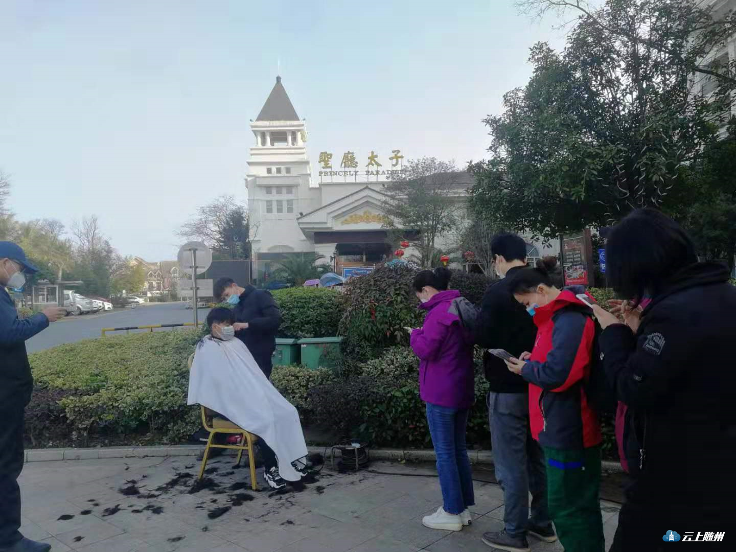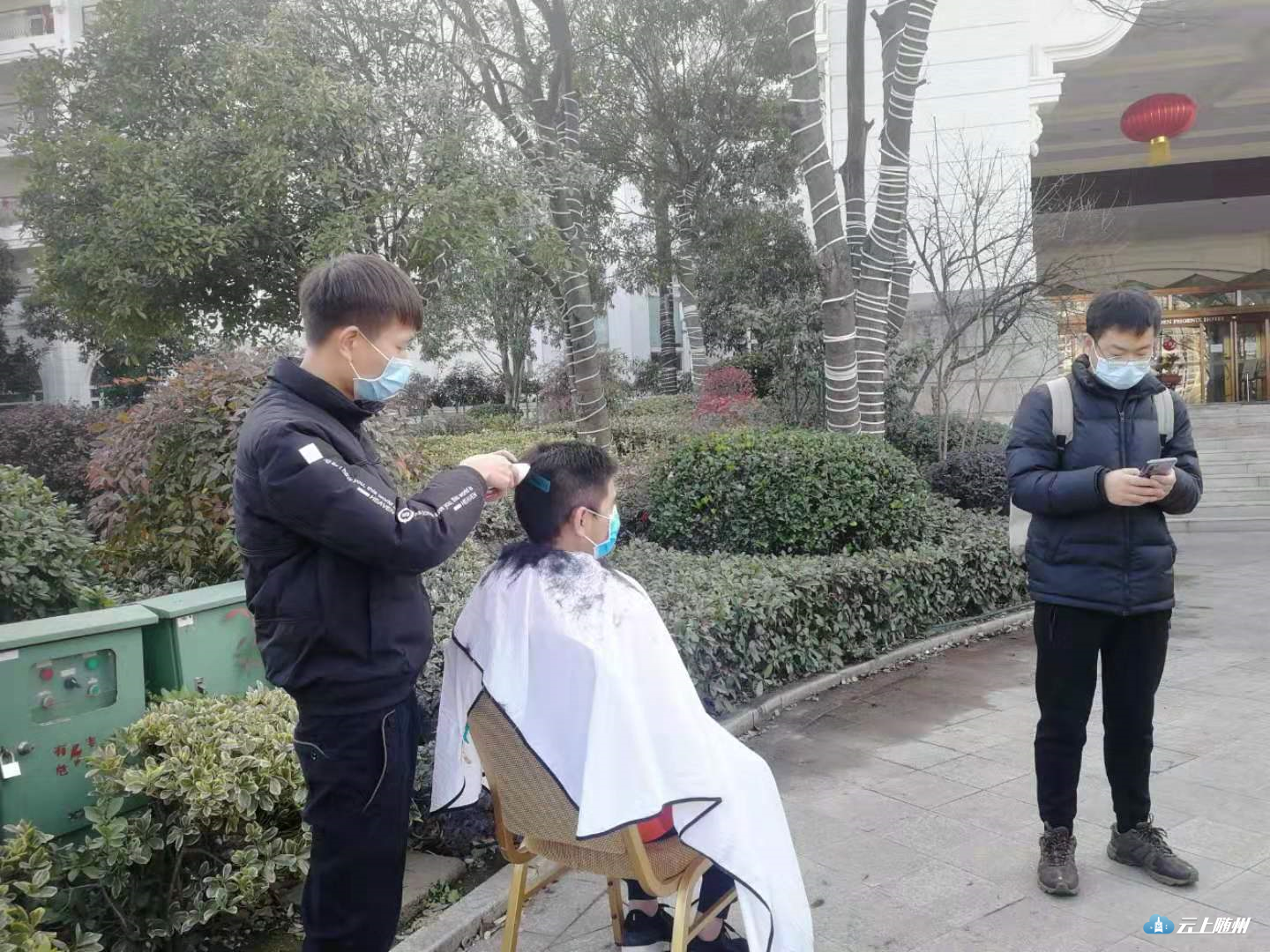 为了更好的投入到援随医疗救助队伍中来,今天下午,来自江西的二十余位医疗队员在凤凰酒店门前集体理发。理发师汪洋介绍,在得知医护人员因救援工作需要修剪头发时,他主动过来当一名志愿者,为江西医疗队员们理发,成为他们专属的“tony老师”。