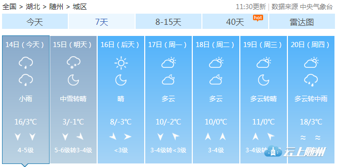 14日白天阴有小雨;14日夜间小雨转雨夹雪;