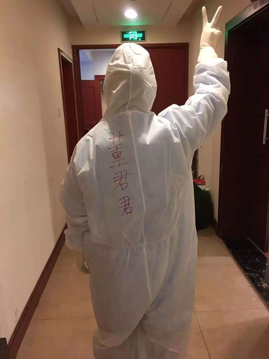 董君君认真细致,一丝不苟的工作态度得到了院领导的认可,将她调到一线,她穿着白大褂、隔离衣、防护服,戴着口罩和护目镜,开始收治病人。董君君说:“由于防护服是一次性的,每去一次厕所都要换一次防护服,为了节省时间、物资,几乎所有的医生上班时间都不喝水,尽量保证一件防护服能穿上半天。”