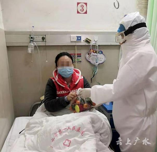 “这是爱心人士捐给医护人员的食品,我们挑选了一部分,送给你们补充营养,希望你们能够早日康复出院!”