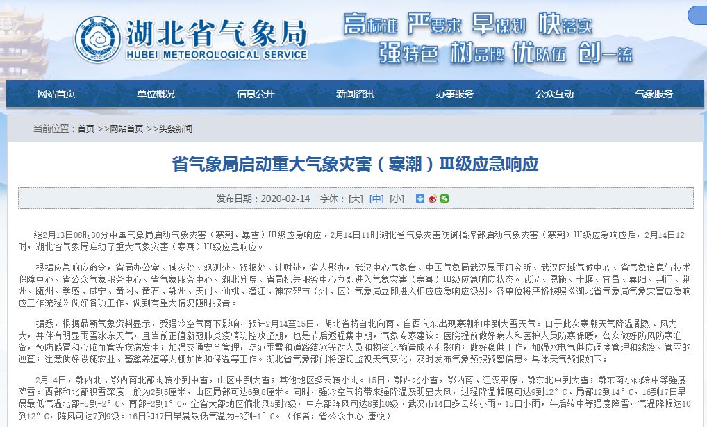 昨天下午,湖北省气象局启动重大气象灾害(寒潮)Ⅲ级应急响应