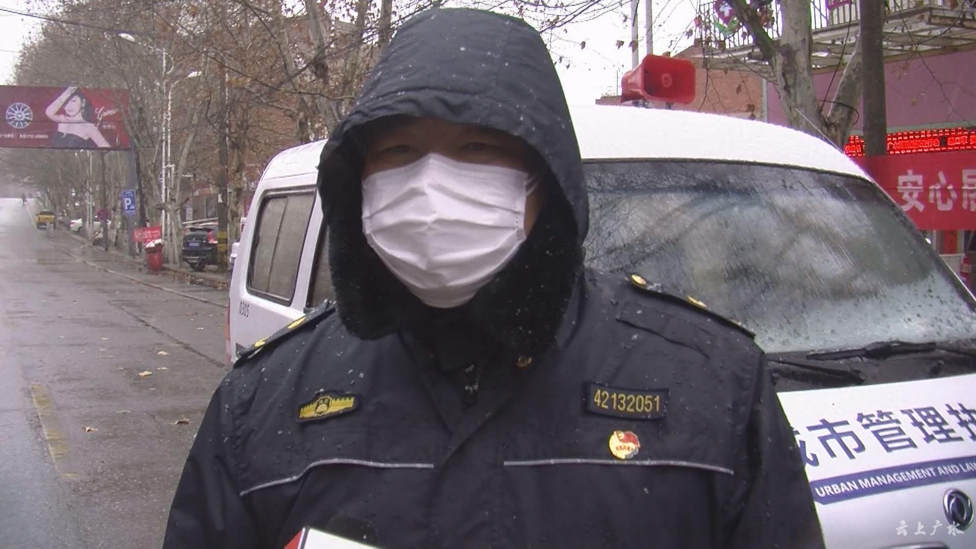 随着寒潮来袭,广水市气温形成“断崖式”降温,48小时气温降幅预计达14℃左右,今天的最低温度是零下4度,但城市管理执法局的工作人员依然坚守在风雪中。