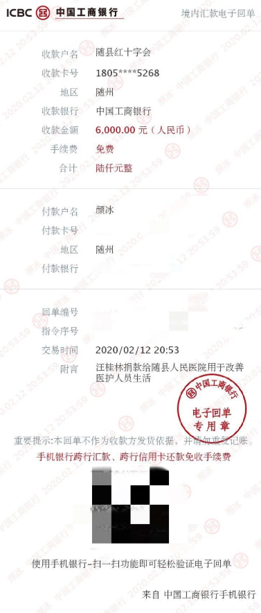 2月12日,汪桂林隔离结束后,受丈夫委托,向随县红十字会捐款6000元,她希望为随县人民医院医护人员改善生活。其实,他们两口子都是企业普通职工,上有老下有小,家庭并不宽裕。问她为什么,她说颜冰告诉她:“医生护士这么照顾我,他们却吃的那么差,一点心意……”