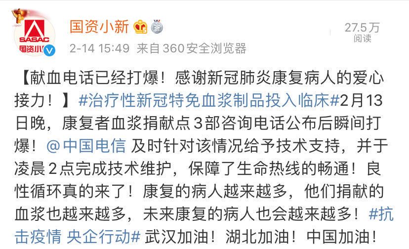 近两日,全国各地不断传来康复患者主动捐献血浆的消息,据@国资小新 消息,咨询电话公布当晚被瞬间打爆: