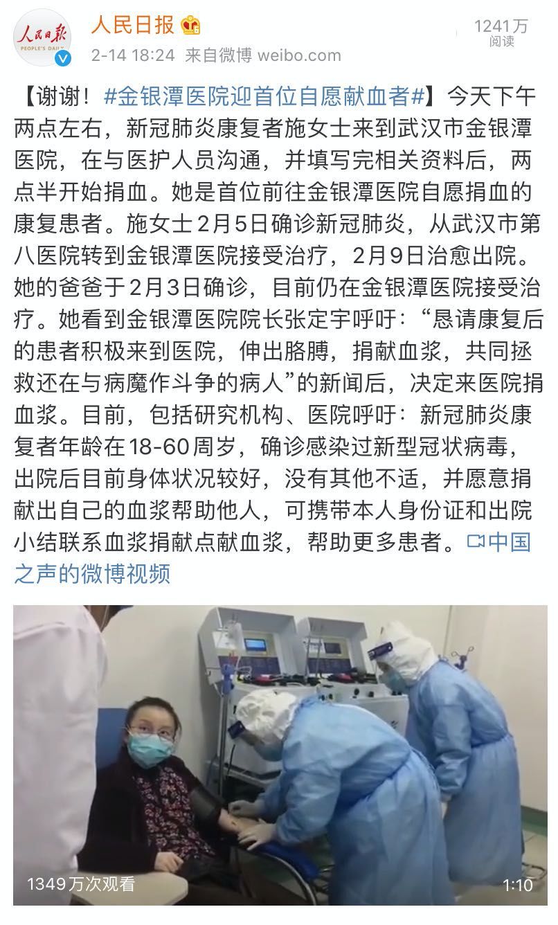2月13日,武汉金银潭医院院长张定宇在新冠肺炎疫情防控工作新闻发布会上表示,康复患者体内有大量的综合抗体对抗病毒,恳请康复后的患者积极来到医院,伸出胳膊,捐献血浆,共同拯救还在与病魔作斗争的病人。