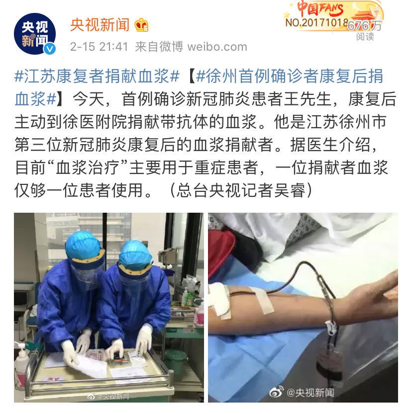 2月4日下午,武汉市江夏区中医医院院长熊侃在微信群里发起捐献倡议:新冠肺炎治愈患者的血浆可能含有抗体,输入重症患者血液中能挽救他们的生命。