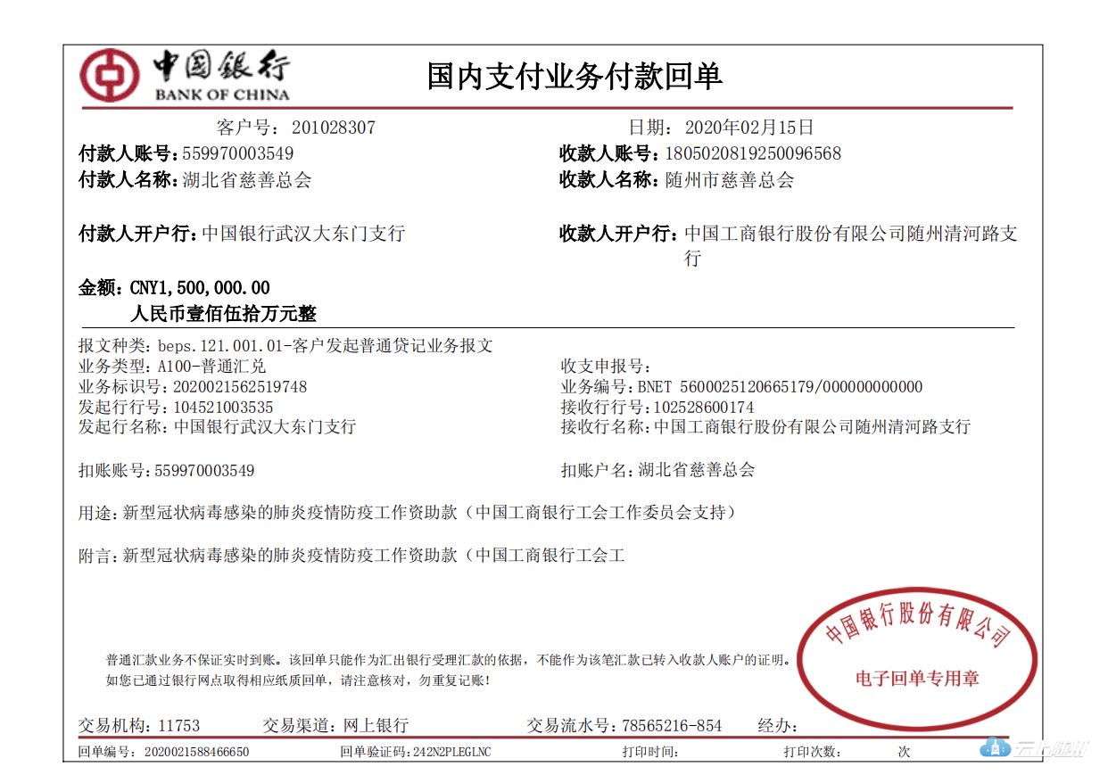 2月15日,中国工商银行再次通过随州市慈善总会向随州市捐赠150万元用于支持新型冠状病毒感染的肺炎疫情防治和防疫物资采购。这是继2月12日工行随州分行捐赠100万元后的第二批次捐赠,是来自工行系统广大干部员工的爱心捐赠。截至目前,工行系统已向随州区域捐赠资金和各类防疫物质超过250万元。