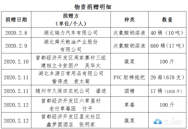 2020年2月3日,曾都经济开发区新冠肺炎防控指挥部发布新冠肺炎疫情防控物资捐赠倡议书以来,得到社会各界爱心人士和企业关爱和支持,踊跃捐赠。