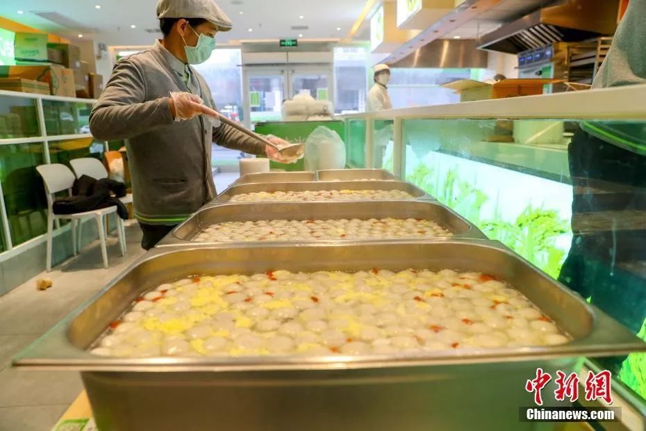 2月8日元宵节,武汉一家餐饮企业在为医务人员准备汤圆。中新社记者 张畅 摄
