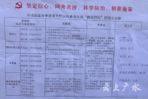 截止目前,应办16个村社区共设置94个区块,共计846位工作人员全部在岗,“四亮四比”情况公示牌均已设置完毕。