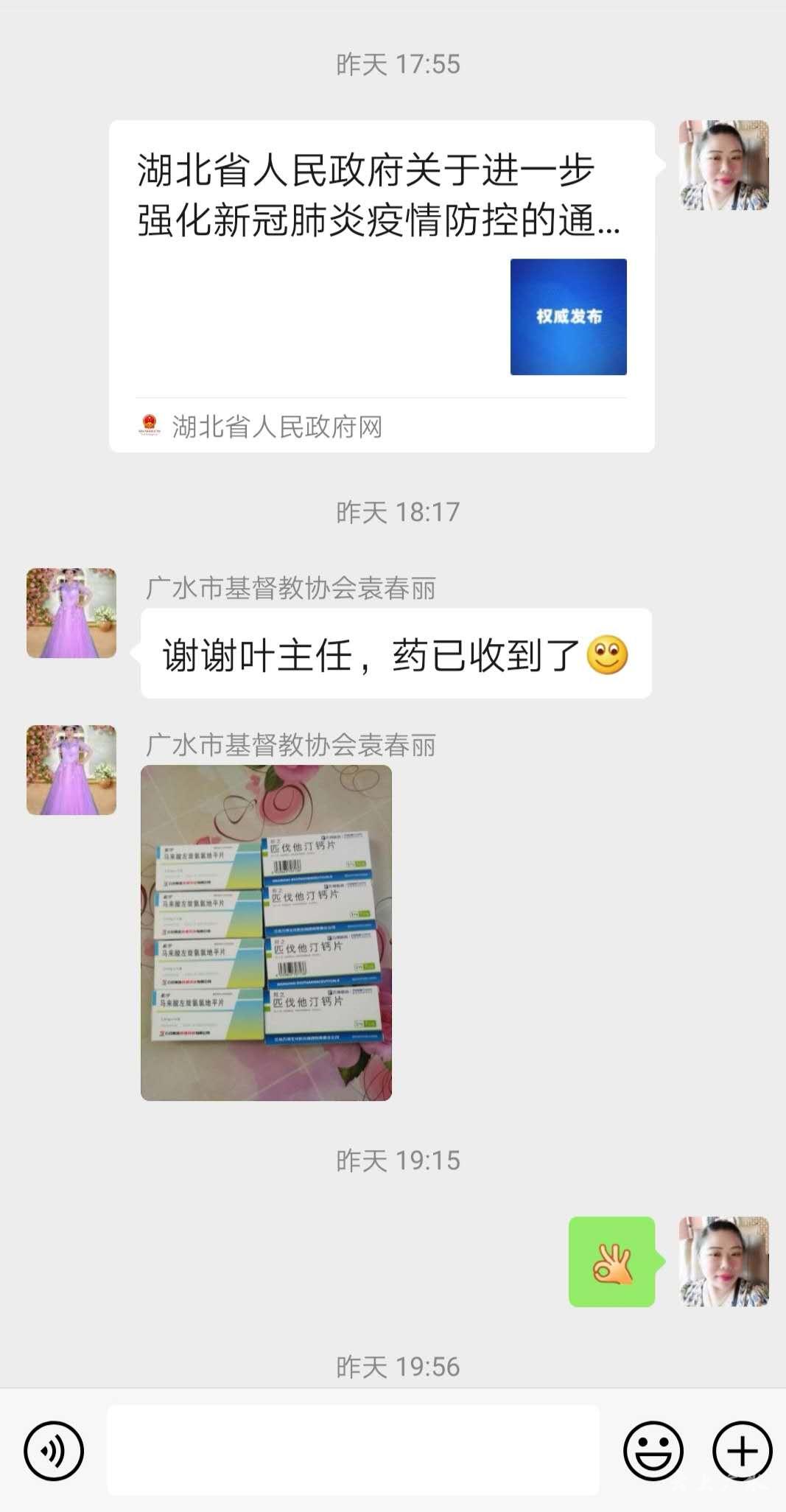 袁春丽需要的降压药在乡镇买不到,只有应山城区有,别的药吃了有很大的副作用。了解到这个情况,广水市民宗局的党员干部叶秀梅主动当起了代购员,叶秀梅家住十里清水桥社区,每天走一个半小时到广水市政府大院民宗局办公室值班,为了帮忙代购药品,她又徒步跑了3、4家药店才买齐。