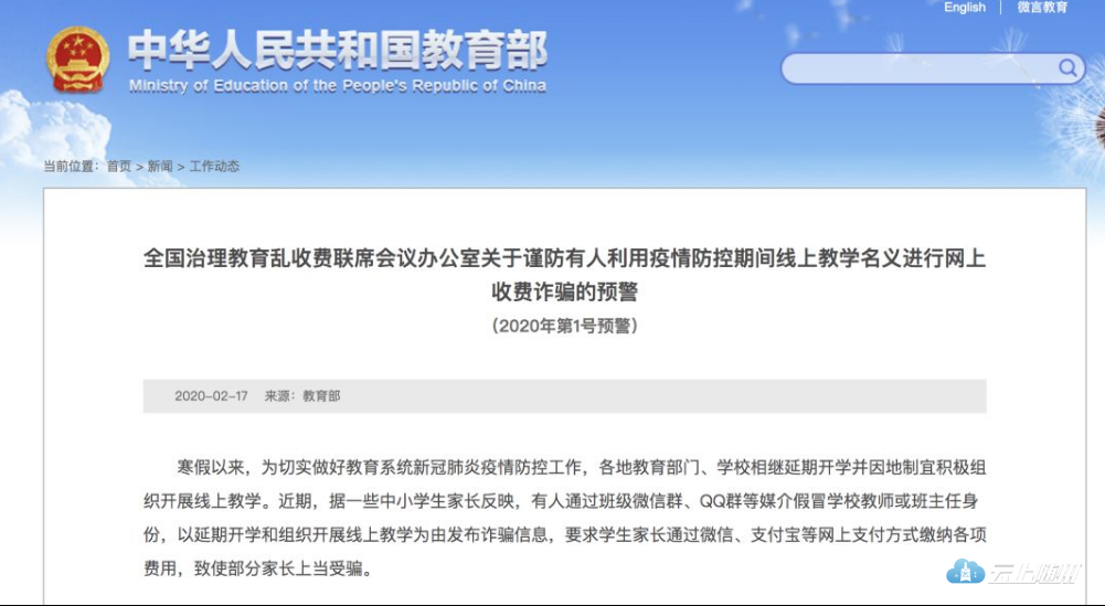 2月17日,教育部网站发布《全国治理教育乱收费联席会议办公室关于谨防有人利用疫情防控期间线上教学名义进行网上收费诈骗的预警(2020年第1号预警)》。