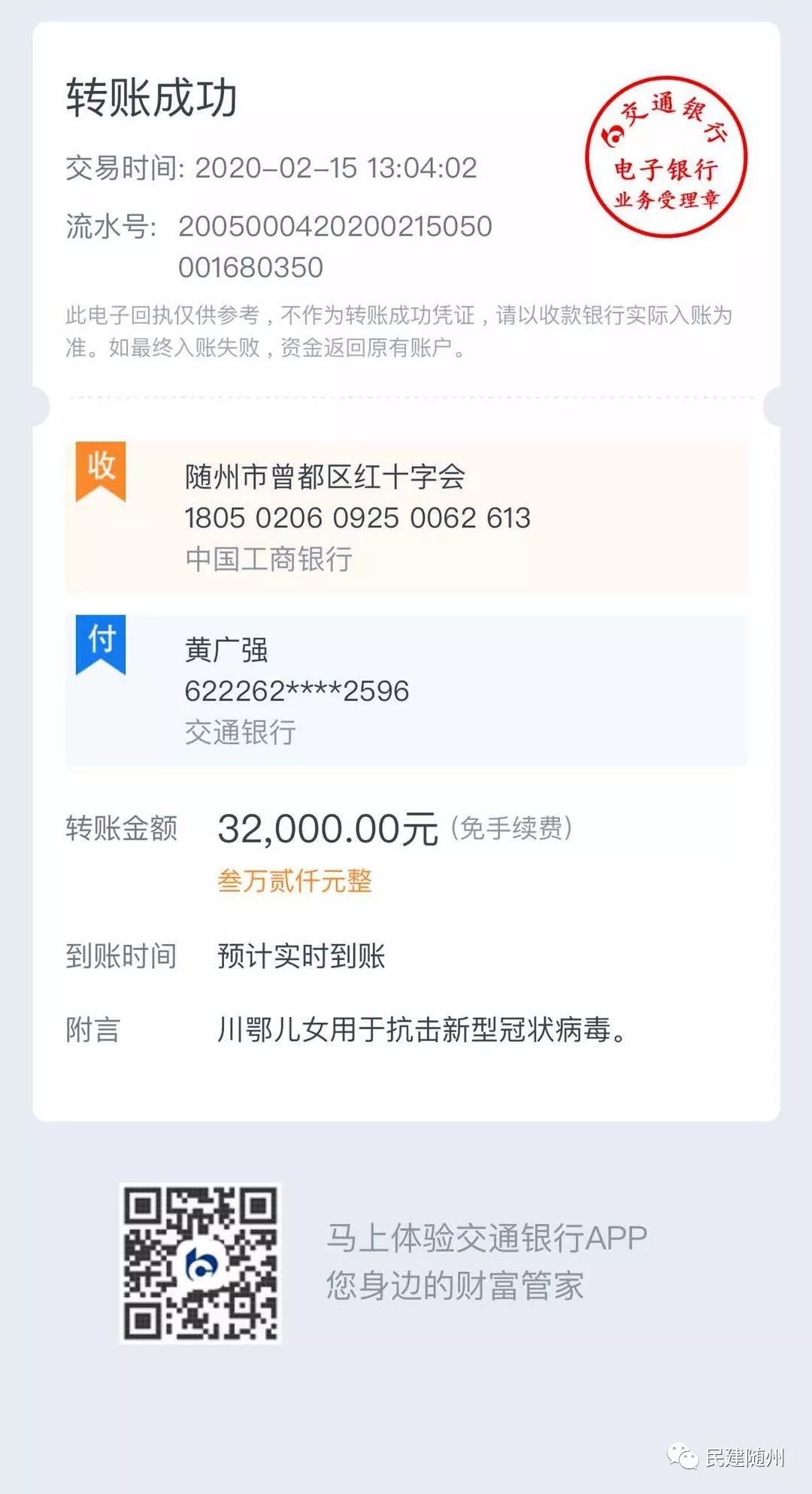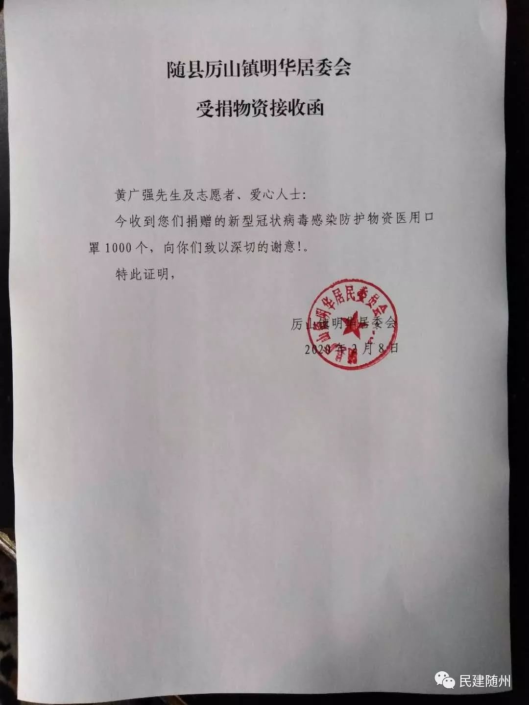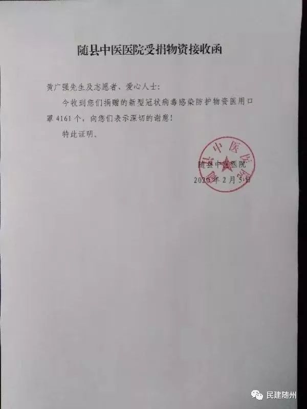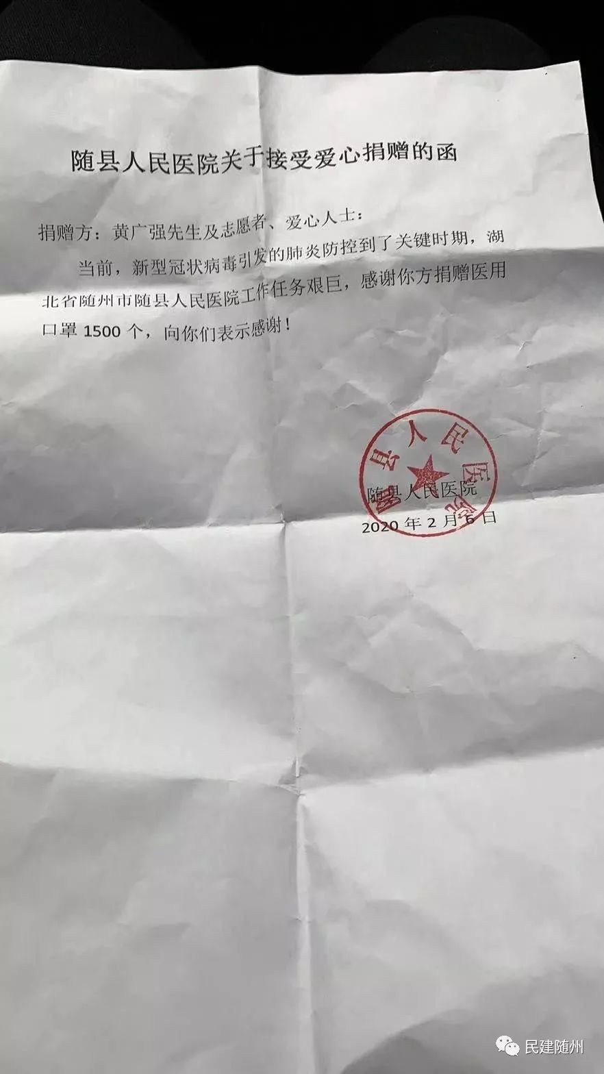 2月15日,随州正下着一场大雪,给抗疫工作带来一定压力。黄广强收到一笔来自四川的捐款32000元,并附一封信,信上写到:“随州疫情牵动着川军将领后代的心,我们的先辈曾在随州的土地上战斗过,热血忠魂洒在随州。2019年10月,黄广强先生组织我们十多位随枣会战的川军将领后代到随州重访抗战旧址,并承担往返所有费用,三天的时间,祭拜烈士,重走昔日战场,新四军红色基地,川军集团军司令部旧址等地,让我们深受感动,希望尽微薄之力帮助随州抗疫!”经黄广强多次沟通,将此笔善款捐赠到曾都区红十字会。
