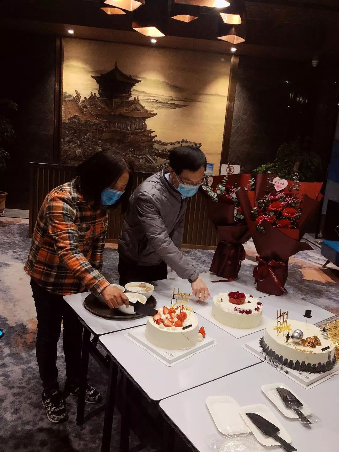 “蛋糕和鲜花包在我身上,你们酒店为三位寿星准备长寿面就可以了。”蒋霖边快速浏览电话簿,边让家人联系蛋糕店。功夫不负有心人,蒋霖的一个亲戚在齐星花园开蛋糕店,目前歇业在家。亲戚表示,蛋糕可以做,却没有水果。蒋霖又去超市买来草莓、芒果等,送到亲戚家门口,经过4个多小时精心制作,三个香甜精美的蛋糕新鲜出炉。