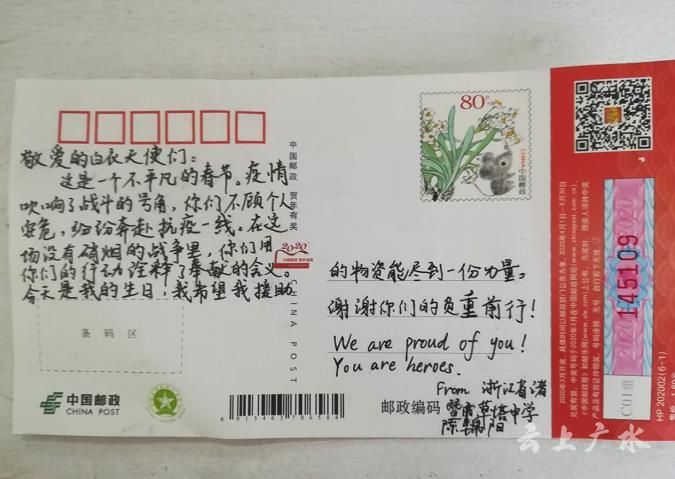 从明信片中获知,这是浙江省诸暨市草塔中学一名叫陈锦阳的学生,为支援广水市抗击新冠病毒,在自己生日当天,为广水市捐赠防控物资。