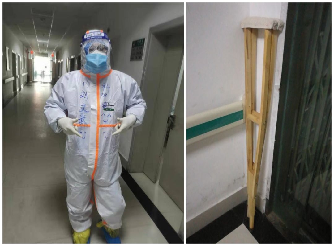 进隔离病区之前,细心的同事李瑞为他送来了一副拐杖。隔离三病区的所有患者都知道,这里有一个走路一瘸一拐的医生,有时候他还会拄着拐杖进进出出。