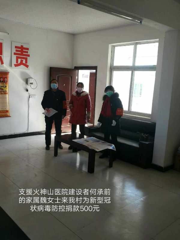 2月19日,支援火神山医院建设者何承前的家属魏女士来到万福店农场三口堰村委会办公室,代表家人捐献500元现金帮助村委会购买口罩。