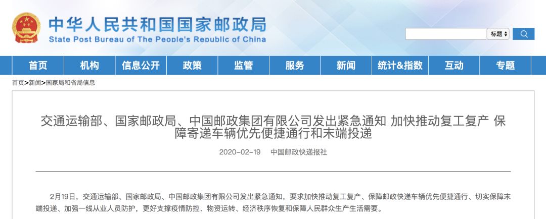 据国家邮政局网站消息,2月19日,交通运输部、国家邮政局、中国邮政集团有限公司发出紧急通知,要求加快推动复工复产、保障邮政快递车辆优先便捷通行、切实保障末端投递、加强一线从业人员防护,更好支撑疫情防控、物资运转、经济秩序恢复和保障人民群众生产生活需要。