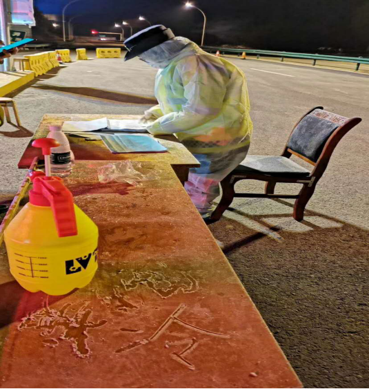 2月17清晨5点09分,前天的一场大雪,让空旷的高速出入口寒风呼啸,室外最低零下3度,登记桌上凝结了厚厚的一层冰霜,路政大队队长薛招依然一丝不苟地检查和核对每一个登记人员信息,并及时反馈给社区。没有豪言壮语,也没有响亮的口号,只有实实在在的行动,把好交通运输防疫进、出关口。