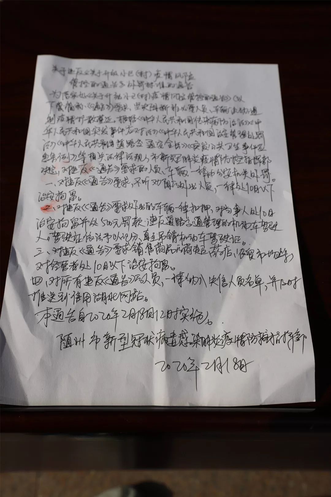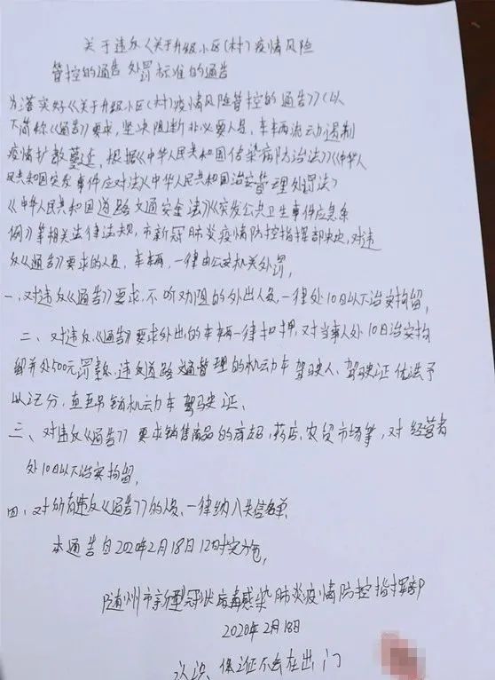 2月18日,随州市疫情防控指挥部发布关于违反《关于升级小区(村)疫情风险管控的通告》处罚标准的通告,全面加强社会管控力度。