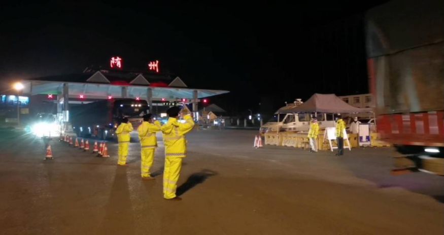 2月19日晚9点,一批运送江西援助物资的车队抵达随州何店高速出口,车身上悬挂“赣鄂一家亲、'赣'出精彩 一路相'随'、同舟共济众志成城”等标语,振奋人心,让此服务点执勤的路政工作人员深受感动,不由自主地列队致敬。
