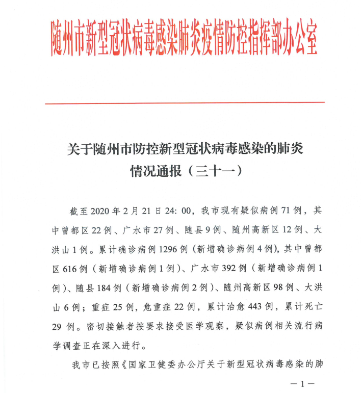 关于随州市防控新型冠状病毒感染的肺炎情况通报(三十一)