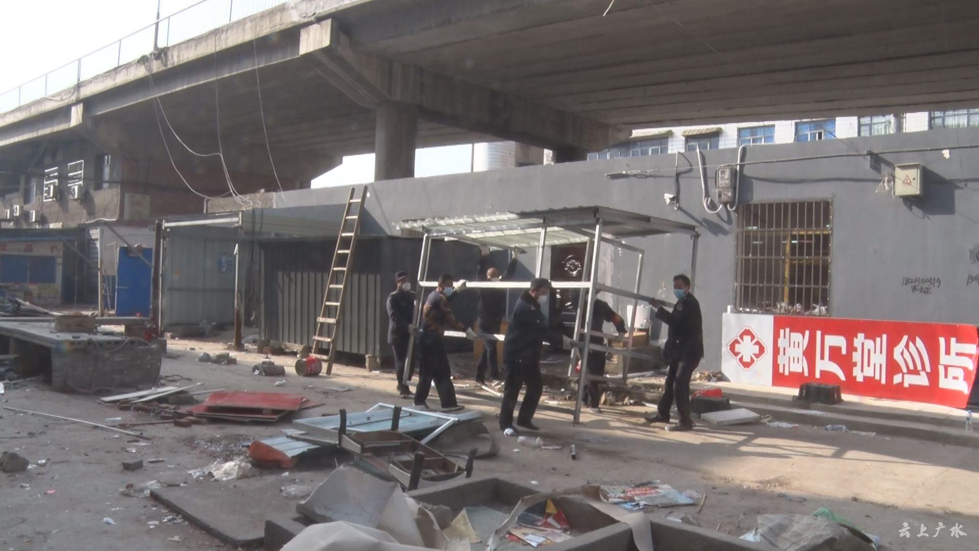 【同期声】广水街道办事处副主任 夏雨:“在广水疫情防控形势非常严峻的情况下,城管二大队一手抓疫情防控,一手抓市场整顿,从2月15日组织15人的工作专班,投入资金15万元,拆除中立交桥下35间占道经营的彩瓦钢蓬,清除占道经营宰杀家禽家畜摊位230个,打通了疫情防控生活物资运输通道,消除疫情传播隐患。”