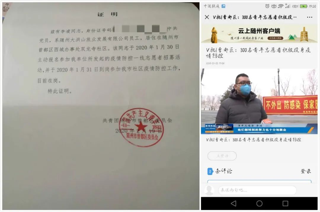 在随州启动疫情防控时,公司党员李凌、郭诚、佘运洲等同志第一时间志愿参加了社区、村组疫情防控;李凌同志在1月30日看到共青团随州市曾都区委员会发布的招募防控一线志愿者的通知后,当天就主动报名,通过体检、集中学习后,作为第一批志愿者被分配到随州市曾都区双龙寺社区参加疫情防控工作,并接受随州电视台现场采访。郭诚、佘运洲两位同志第一时间志愿参加了当地村委会疫情防控。