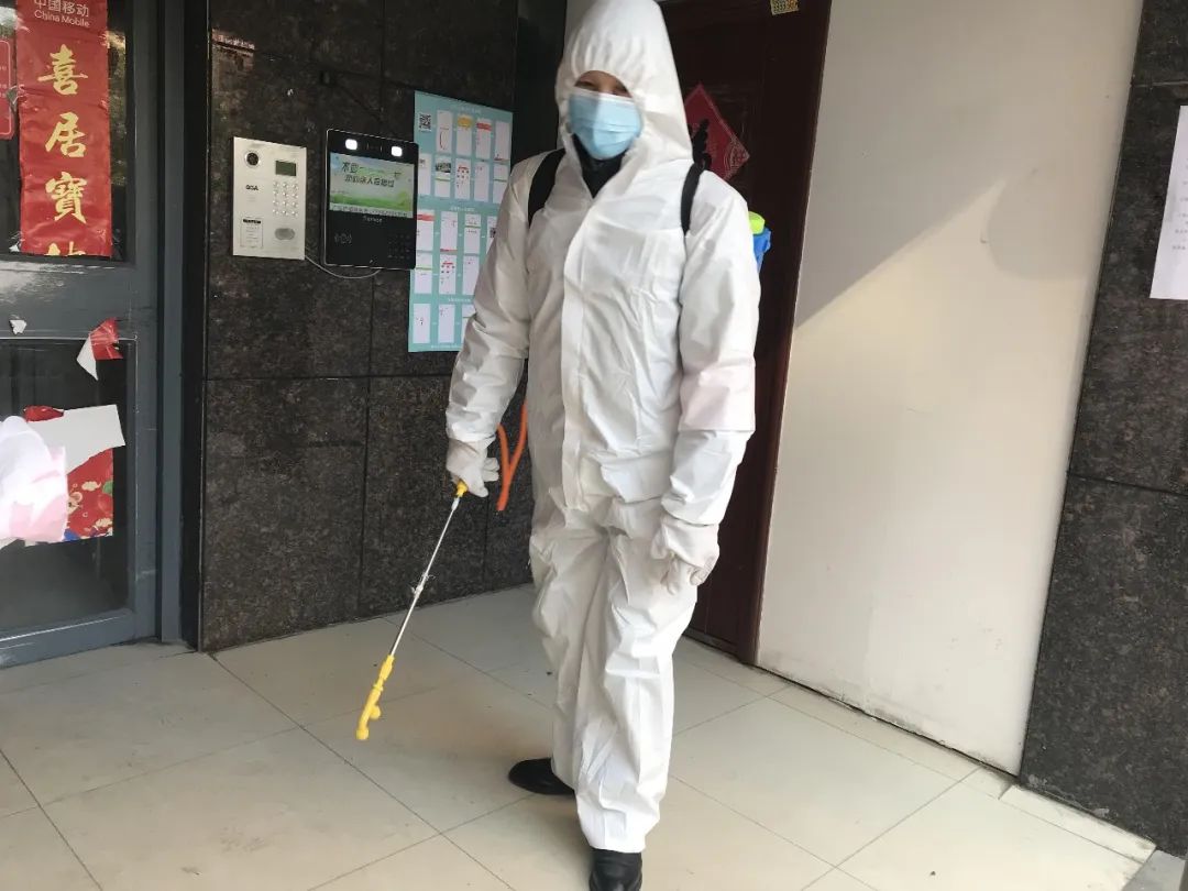 齐星花园每栋楼有3个单元33层,程艳丽与同事穿着不透气的防护服,背上满满的药桶,忍受着刺鼻的气味,一层层楼收拾、装运垃圾,一层层消毒楼梯间、电梯等公共空间。