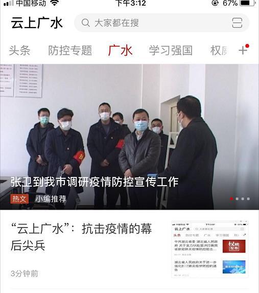 新冠肺炎疫情发生后,作为新媒体一员的 “长江云•云上广水”平台充分利用媒体特点,第一时间发挥融媒体矩阵作用,打响线上防控阻击战,从权威、一线、创作三个方面出发,发挥自身优势,在充分保证宣传报道的时效性和权威性的同时,又创作大量作品,成为融媒体在这次抗击疫情宣传工作的一支尖兵。用户活跃度在“长江云”周报县级排名前五,受到各级宣传主管部门的肯定。