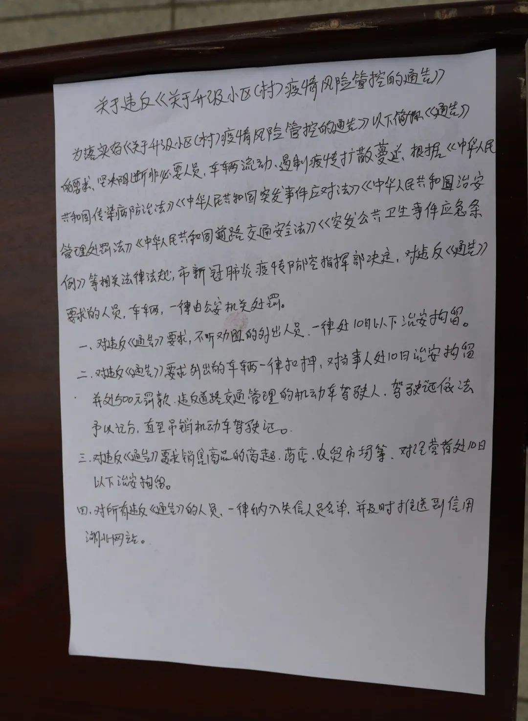 2月18日,随州市疫情防控指挥部发布关于违反《关于升级小区(村)疫情风险管控的通告》处罚标准的通告,全面加强社会管控力度。