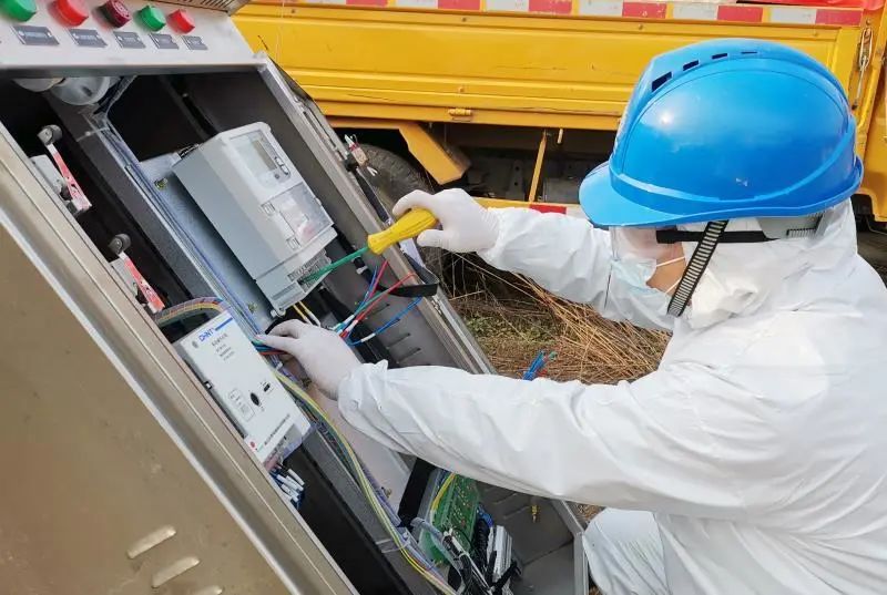 立杆、组装台架、放电缆、安装变压器和配电柜……工人们紧张有序的完成一道道工序。由于穿着不透气的防护服,平常熟练的动作,做起来变得吃力。为避开工厂处理医疗废物的工作高峰期,17:36分,在提前组立起电杆安装好变压器后,工人们迅速停电、验电、挂接电线……开始对变压器进行搭火工作。