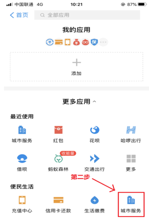 进入更多以后,在此页找到便民生活一栏,下方有个【城市服务】,点击进入;