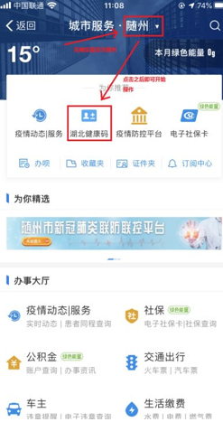 进入以后,界面正上方会显示【城市服务 随州】几个字,若不是随州,点击并修改城市选择随州。然后下方有个为你推荐一栏,找到湖北健康码这一项,点击进入;