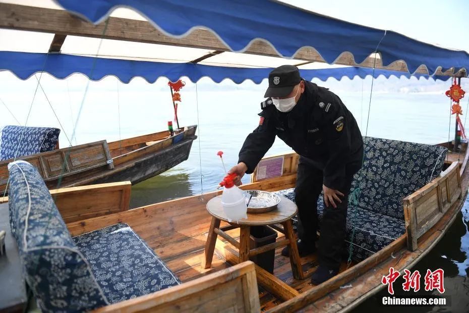 图为西湖景区工作人员对游船进行消毒。中新社记者 王刚 摄