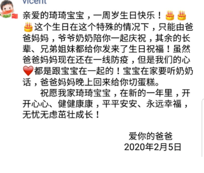 而对于队员熊鑫来说第二天也是特殊的日子,他在朋友圈给他家过一周岁的宝宝送上了最特别的生日祝福:“亲爱的琦琦宝宝,一周岁生日快乐!这个生日在这个特殊的情况下……虽然爸爸妈妈现在还在一线防疫,但是我们的心都是跟宝宝在一起的!……爱你的爸爸”