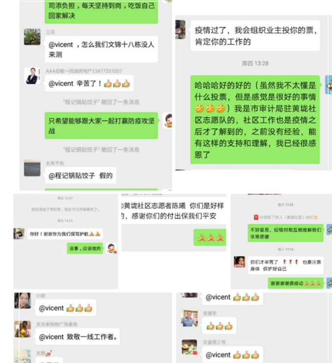 突击队员的工作需要“智”,学会换位思考,针对每一名群众的心思因人制宜,晓之以理动之以情;但在这个疫情关口,更需要“勇”,以敬畏生命的严谨态度,面对每天接触的不同人群。队员中有孩子还是幼儿的父母,有双双在一线战疫的夫妻,他们在防护措施有限、尽力保护自己的同时,勇于站出来为正义发声。队员张瑞在面对情绪激动群众当面骂口时,依然坚持原则、毫不退缩。他们知道,他们是在为大多数人民群众的生命安全发声。队员陈曦在自己的每日值守趣闻中写到:“我敬佩心中恐惧而且战胜恐惧的人,因为真实。值勤小区有两个门栋单元整楼封锁,物资需要送上去,值守同事有想用绳子拉上去的,有放门口的,有用电梯的,跟我执勤的的同事去了一趟,回来让我给他全身酒精消毒,念念叨叨的说,心里还是有点害怕。面对病毒生死谁都会害怕,这才是生而为人的人之常情。”