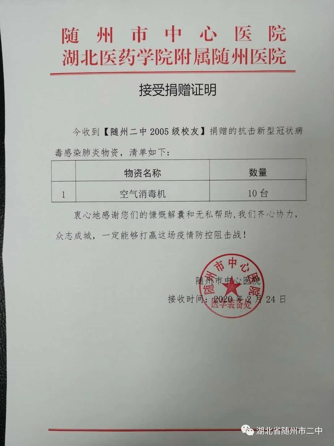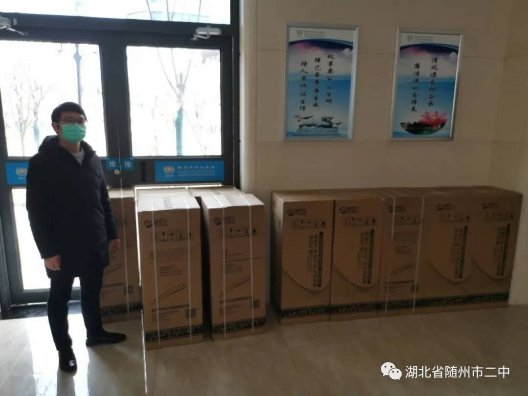 2月24日下午,满载着随州二中校友爱心的物资送达随州,十台空气消毒机在随州市中心医院完成了捐赠签收。