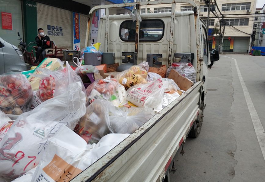 2月25日,上午9时,澴潭镇观音岩村物资代购员杨明想开着小卡车来到镇上的超市。超市工作人员已经根据他的微信信息提前下好了单,配齐了货。细心的观音岩村党支部书记汤中成在每一个装满物品、附上超市结帐小票的袋子上,用粗粗的记号笔一一写上了货主名字。