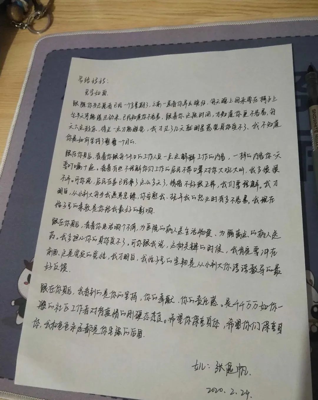 跟在你身后,看着你电话响个不停,为医院的病人送生活物资、为隔离点的病人送药。我多担心你的身体受不了,可你跟我说,这种关键的时候,我肯定要冲在前面,这是党员的党性,我才明白,我性子里的坚韧是从小到大你谆谆教导的最好反馈。
