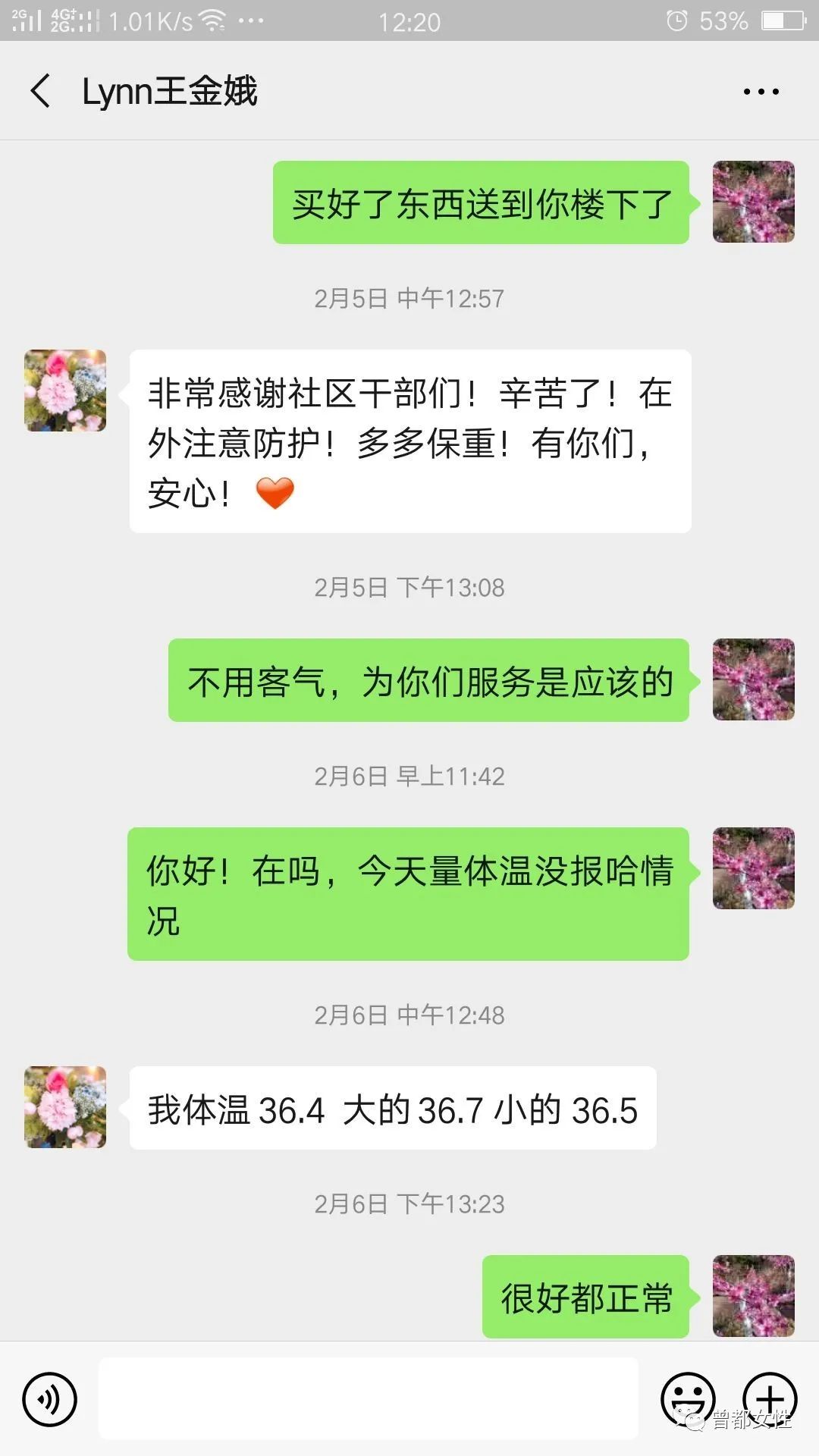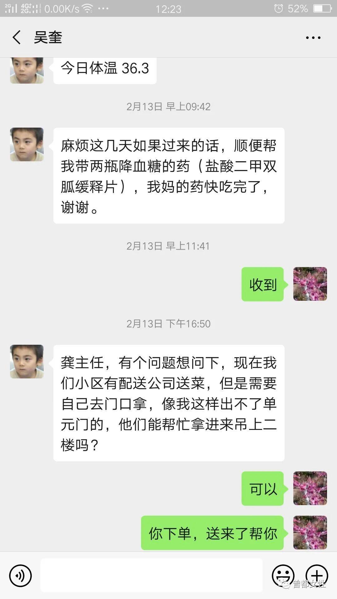 下午1:00,上午配送物资结束后,回社区简单吃过午饭后,便开始了下午的工作。2月15日,随州温度骤降,一场大雪无疑加大了各项工作开展的难度,她和两名军人志愿者顶着风雪将二十多坛煤气挨家挨户送到居民的家里,她说对大家说,“没有煤气罐你们怎么做饭,只要能保证你们的生活,我们多辛苦都可以!”物资配送完后,她还要对有确诊病例的家庭进行心理疏导、询问居家隔离人员体温、了解居民生活近况……就是这些让在家隔离心情浮躁的居民心里多了一丝暖意,龚巧玲也被她们亲切的称为“龚大姐”。