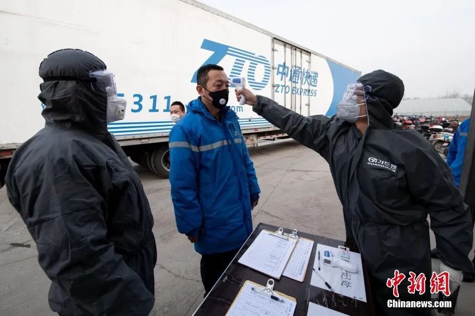 2月20日,山西省太原市,在中通快递山西转运中心,员工进入园区前接受体温检测。中新社记者 韦亮 摄